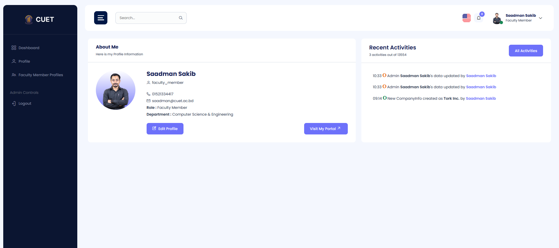 The Faculty Member Profile module allows administrators to manage faculty member details, including their administrative roles, personal contact information, and activity status. You can view, add, edit, activate/deactivate, and manage faculty member profiles as needed.